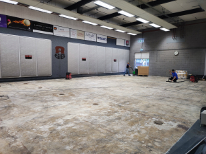 De renovatie van onze zaalvloeren werd eind juli gestart met het slopen en afvoeren van de versleten vloeren. Daaraan voorafgaande hebben we onze tt-tafels, afzethekjes en overige losse spullen naar de kantine verplaatst en heeft het Sportbedrijf Rotterdam de gymnastiekspullen naar de achterste kleedkamers overgebracht.